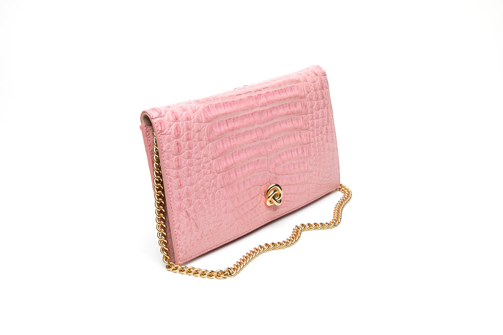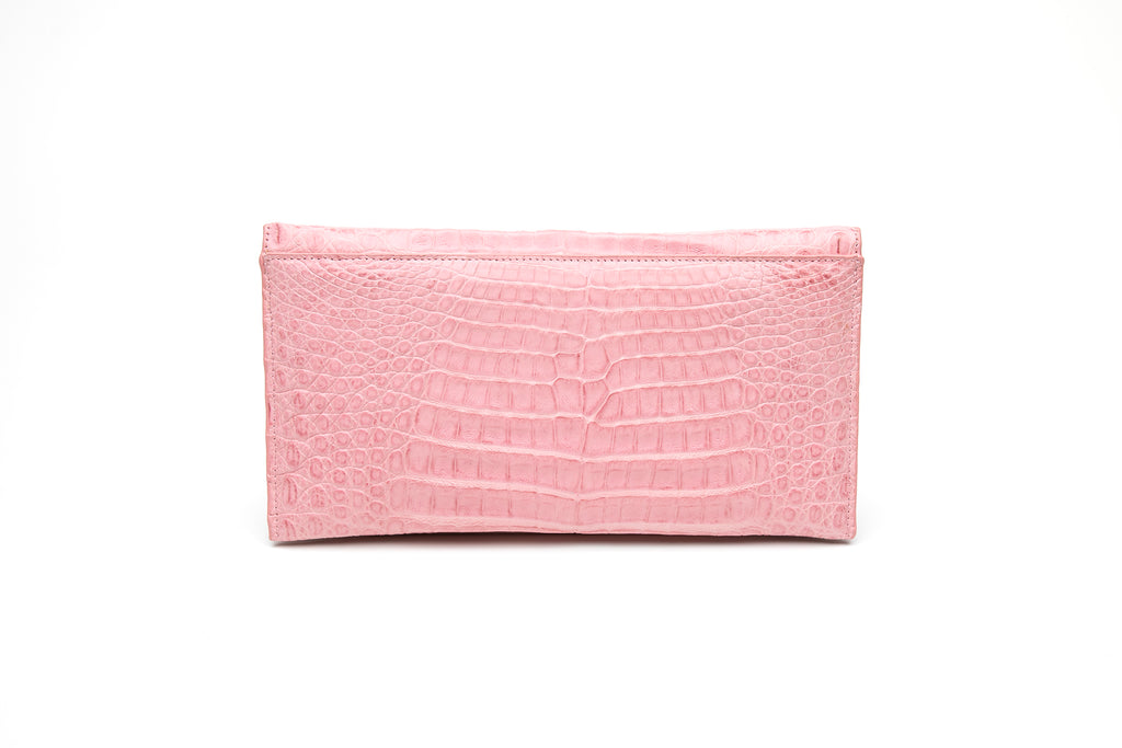 This caiman crocodile clutch is timeless and classic. It is sleek and beautiful and can be worn with jeans or with a cocktail dress. It comfortably fits a cell phone, lipstick, keys, and credit cards. The bag comes with a detachable chain shoulder strap measuring 25" (drop 17") and has a gold plated knot hardware embellishment. Each of our bags is lined with lavender suede and contains an inside pocket perfect for credit cards. This bag contains a magnetic closure.