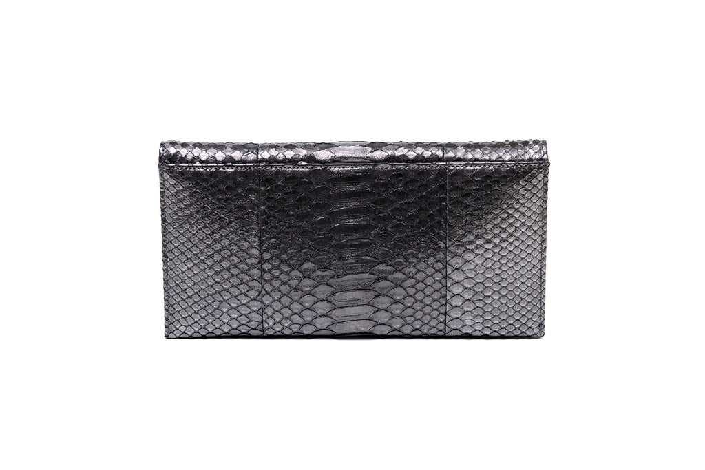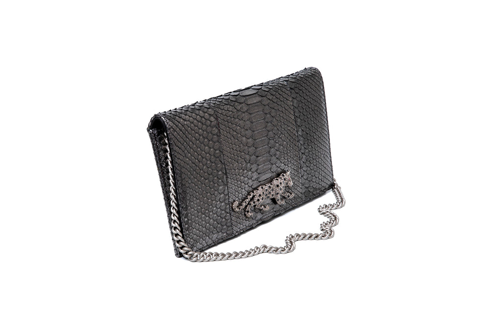 This python clutch is timeless and classic.  It is sleek and beautiful and can be worn with jeans or with an evening dress.  It comfortably fits a cell phone, lipstick, keys, and credit cards. The bag comes with a detachable chain shoulder strap measuring 25" (drop 17").   The silver plated leopard hardware is made with Swarovski Crystals.  Each of our bags is lined with lavender suede and contains an inside pocket perfect for credit cards.  This bag contains a magnetic closure.