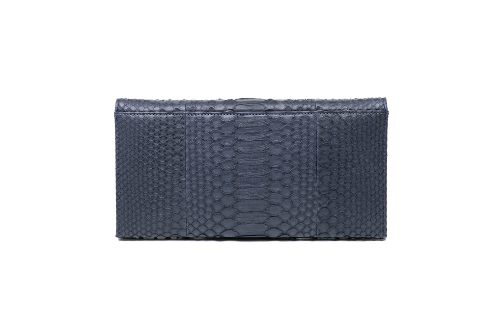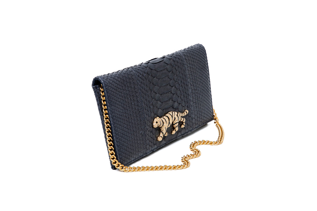 This python clutch is timeless and classic.  It is sleek and beautiful and can be worn with jeans or with an evening dress.  It comfortably fits a cell phone, lipstick, keys, and credit cards. The bag comes with a detachable chain shoulder strap measuring 25" (drop 17").   The gold plated tiger hardware is made with Swarovski Crystals.  Each of our bags is lined with lavender suede and contains an inside pocket perfect for credit cards.  This bag contains a magnetic closure.