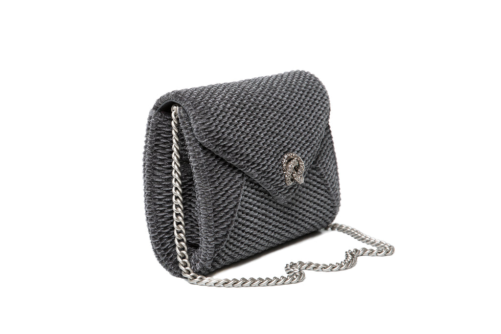 This beautiful woven velvet clutch has a side gusset so it can comfortably hold all of your essentials including the iPhone Max! It can be carried as a clutch or a shoulder bag. This bag comes with a detachable chain shoulder strap measuring 25" (drop 17"). The silver plated knot hardware is a signature classic and is made using Swarovski crystals. Each of our bags is lined with lavender suede and contains an inside pocket perfect for credit cards. This bag contains a magnetic closure.