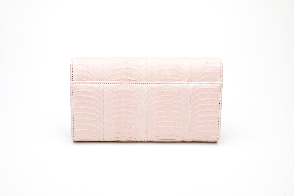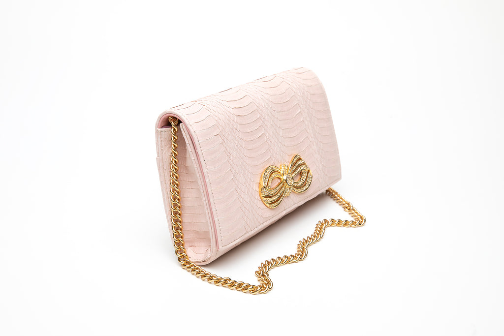 This beautiful snake skin bag can be worn as a clutch or as a shoulder bag. The bag comes with a detachable chain shoulder strap measuring 25" (drop 17"). The gold plated bow hardware is made with Swarovski Crystals. Each of our bags is lined with lavender suede and contains an inside pocket perfect for credit cards. This bag contains a magnetic closure.