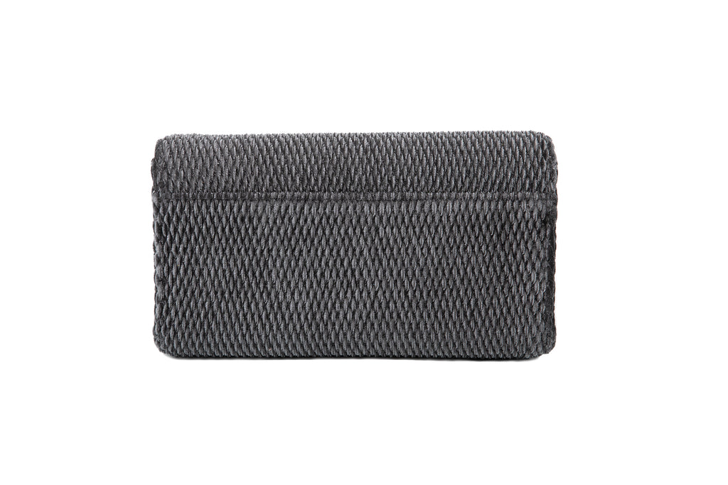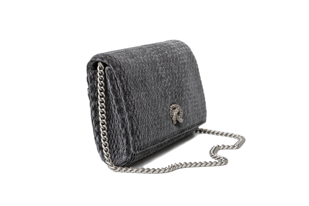 This beautiful woven velvet bag can be worn as a clutch or as a shoulder bag.  It comes with a detachable chain shoulder strap measuring 25" (drop 17").  Our signature knot hardware is silver plated and made using Swarovski crystals.  Each of our bags is lined with lavender suede and contains an inside pocket perfect for credit cards.  This bag contains a magnetic closure.